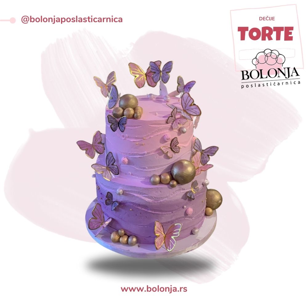 Elegantna trospratna torta u ljubičastim tonovima, dekorisana leptirićima i zlatnim perlama. Savršen izbor za devojčice koje vole bajke i nežne pastelne boje.